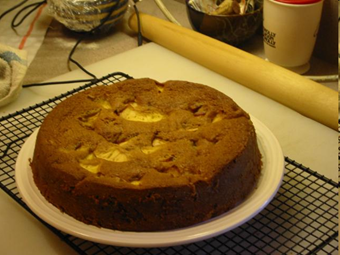 The batter contains brown sugar, butter, buttermilk, and chopped fresh rhubarb, and is sprinkled with a brown sugar-cinnamon-walnut topping. The cake may be served for dessert or as a coffee cake.